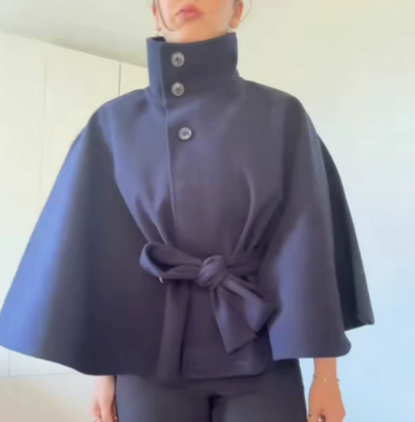This elegant cape jacket with a high neckline and belt is a refined and timeless addition to your outerwear collection. It embodies sophistication with its flowing silhouette and structured finish. Designed to offer effortless style and warmth, it features a high-button collar that adds an elevated touch, while the adjustable waist belt beautifully defines your figure. The cape-inspired cut gracefully drapes over the shoulders, providing both comfort and a sense of modern chic. This jacket is ideal for layering over smart or casual outfits and transitions seamlessly from daywear to evening wear – a true wardrobe essential for the colder months.
