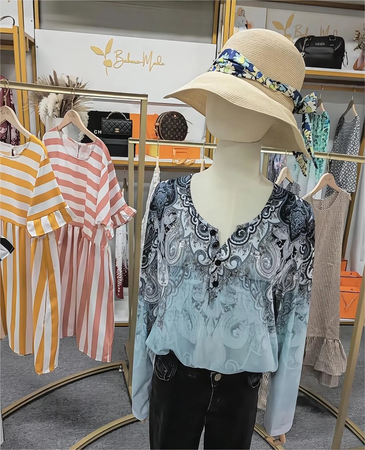 Meet our FallStil blue with gray luxury top with V-neck and long sleeves - where elegance and the magic of the ocean meet.